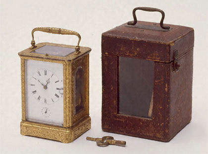 「フランス枕」と呼ばれるネジ巻き式の置時計。江戸時代後期、佐賀藩武雄領が行なった貿易港長崎でのさまざまな物品購入の記録である『長崎方控』中にも、「枕時計」「置時計」は随所に見られるが、嘉永3(1850)年には「リン打枕時計並びに目覚付」とある。専用の窓付の箱に収納され、全体に細密な唐草様の文様と金メッキが施されている。本体側面にはめ込まれたガラスから内部のゼンマイなど、細かな構造も観察できる。裏蓋を開くと銀色のベルがあり、まさに「輪打(リン打ち)」となっていることが確認できる。また、その下部に小さく「BECHOT A PARIS」と刻銘がある。武雄鍋島家旧蔵資料。