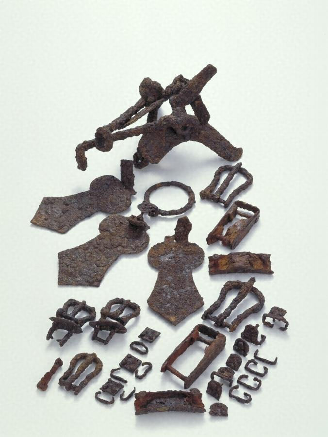 鉄製f字形鏡板付轡1・鉄製環状雲珠一式・鉄製剣菱形杏葉3・鉄製鞍金具(鞖《しおで》金具)2・木芯鉄板張輪鐙一対・鉸具1・留金具4