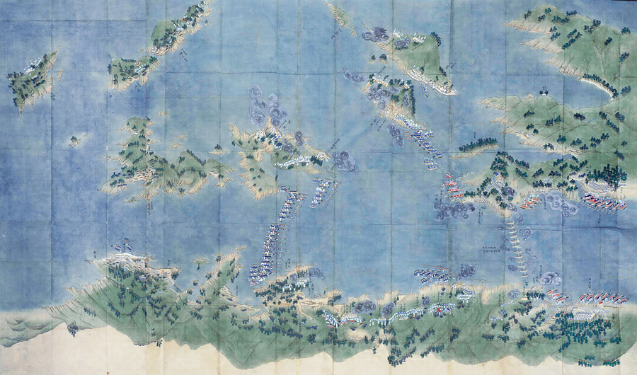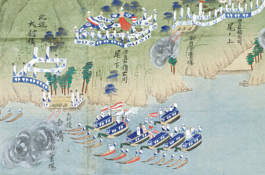 佐賀藩は、福岡藩と隔年交替で寛永19年(1642)から幕末まで長崎警備をつとめた。本図には、画面右端の西泊・戸町両番所から、高島までの範囲が描かれており、佐賀・福岡両藩の合同調練が行われている。西泊・戸町両番所、ならびに内目の一番~三番御台場(一番・太田尾、二番・女神、三番・神崎)には福岡藩、外目の四番~七番御台場(四番・白崎、五番・高鉾、六番・長刀岩、七番・陰ノ尾)には佐賀藩が配置につき、三番御台場・神崎付近で長崎奉行が見守っている。二番御台場・女神と三番御台場・神崎の海峡には、「御當番方張切」として、当番藩の福岡藩による舟橋がつくられている。