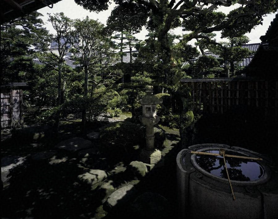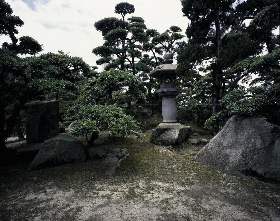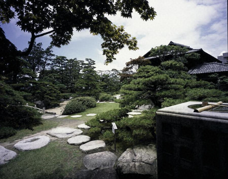 庭園の北東隅から南西隅に向けて枯川が適度に曲線を描きながら設けられている。枯川中ほど北側には本庭園最大の築山が位置するが,2つの頂からなるこの築山は江戸時代の御殿に伴う庭園を取り込んだ可能性が高い。枯川や築山のある庭園の重要な箇所には,雪見灯籠や春日灯籠など様々な形状と大きさの石造物が配されている。特に枯川の中ほどに掛かる庵治石製の石橋や大書院の北側に置かれた銀閣寺型手水鉢は例を見ない石造物である。園内の飛石や沓脱石とともに,必要以上に大きさを誇る石造物・景石は本庭園の特徴の一つでもある。