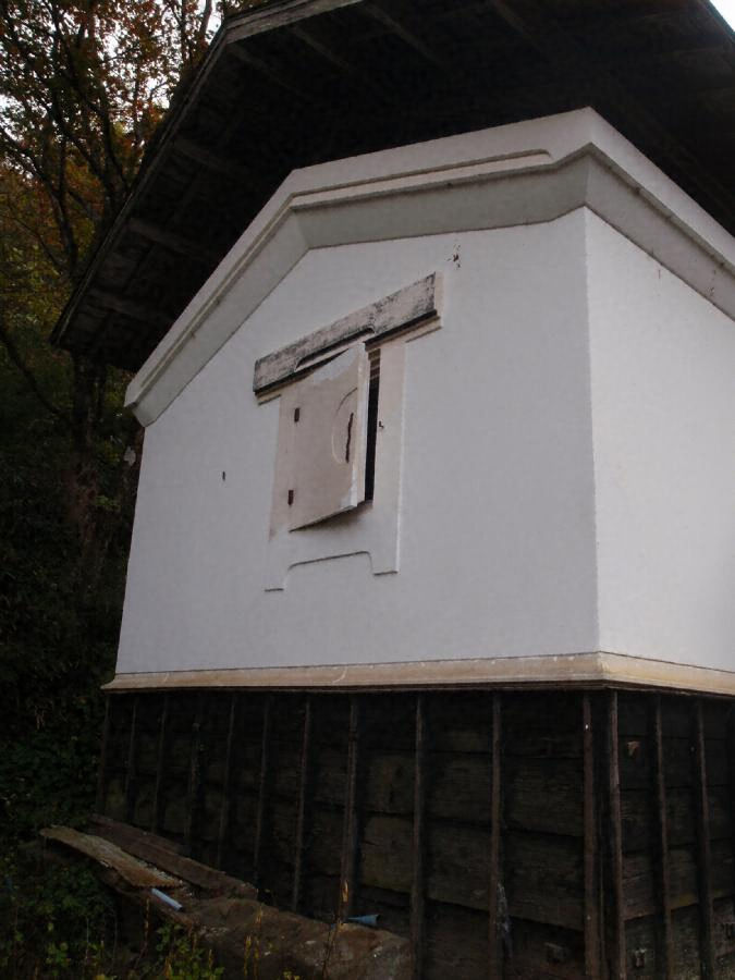 敷地最奥部、一段高い位置に建つ。桁行五間、梁間二間半の土蔵造で、屋根は置屋根鉄板葺。外壁は腰下見板張上部は白漆喰塗とする。背面側のみ三尺、他は一尺五寸間隔で柱を建てる。北側正面には庇を設け、扉は土扉、板戸、格子戸の三重とするなど質が高い。