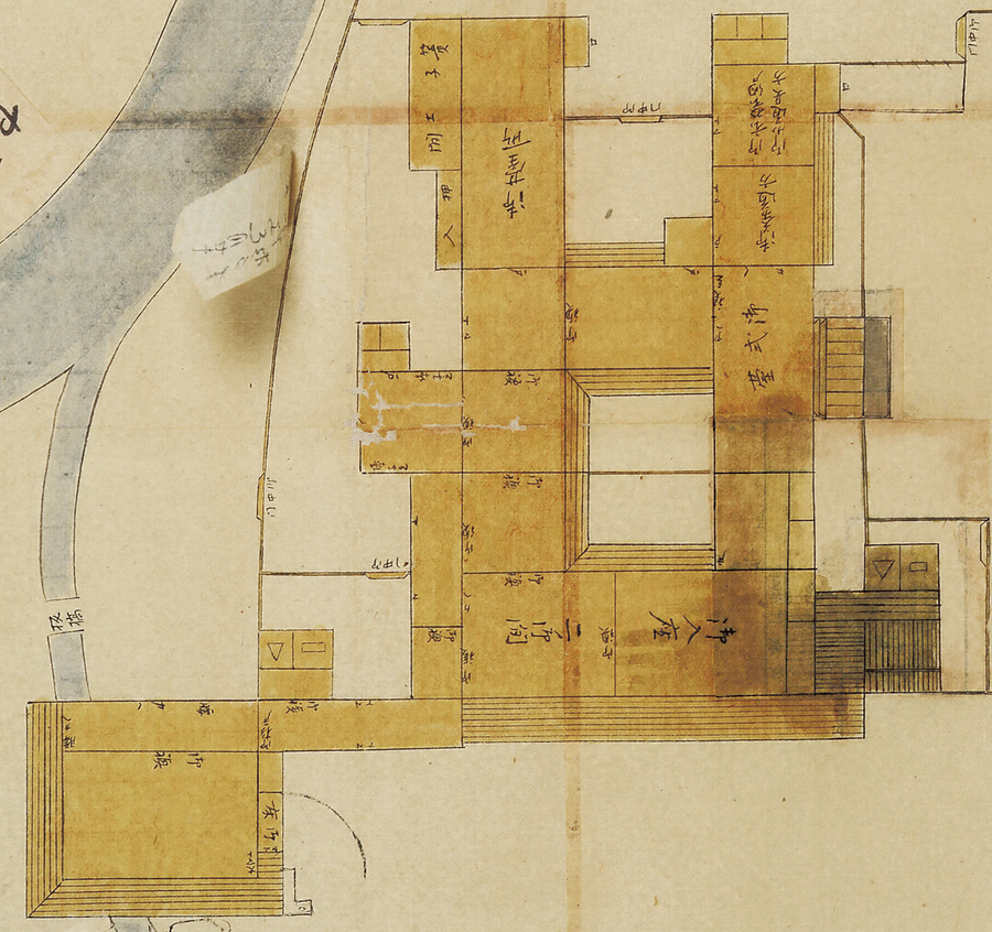 神野御茶屋は、弘化3年(1846)に10代佐賀藩主鍋島直正が造営した別邸。本図より製作時期が遡る造営計画図と見られる別本の図面の間取りと比べると、御茶屋(無限青山亭)の御式台周辺に改変箇所が見られ、付箋が貼られている。またこの改変後の間取りが現状に通ずることから、本図はのちの改築事情を示した絵図と思われる。