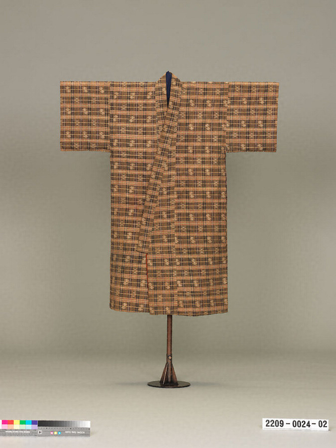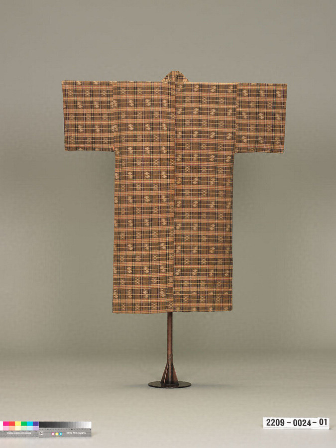 格子に緯絣のこような衣裳を手縞と称する。緯糸の青に木綿糸を、経緯糸に絹を使用した交織。衿を外側に折り返して着装する。裏裂は紅色の平絹と木綿。衣裳 袷。