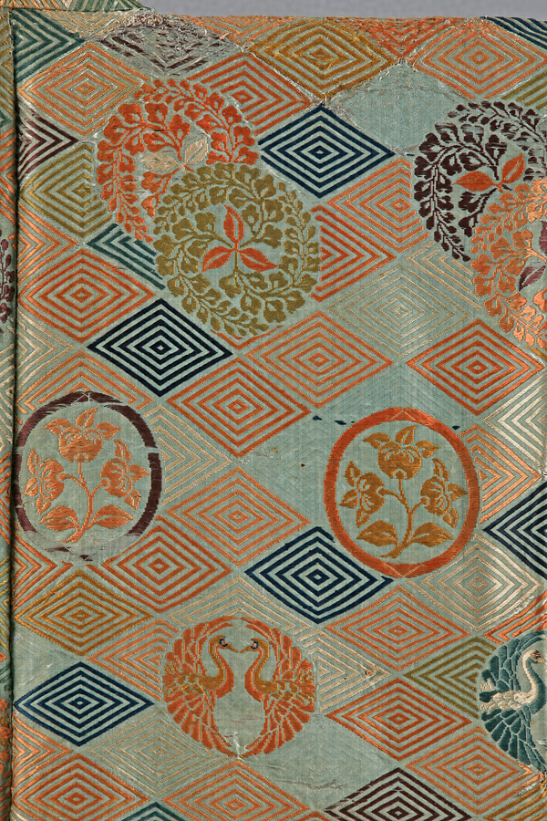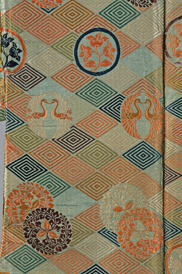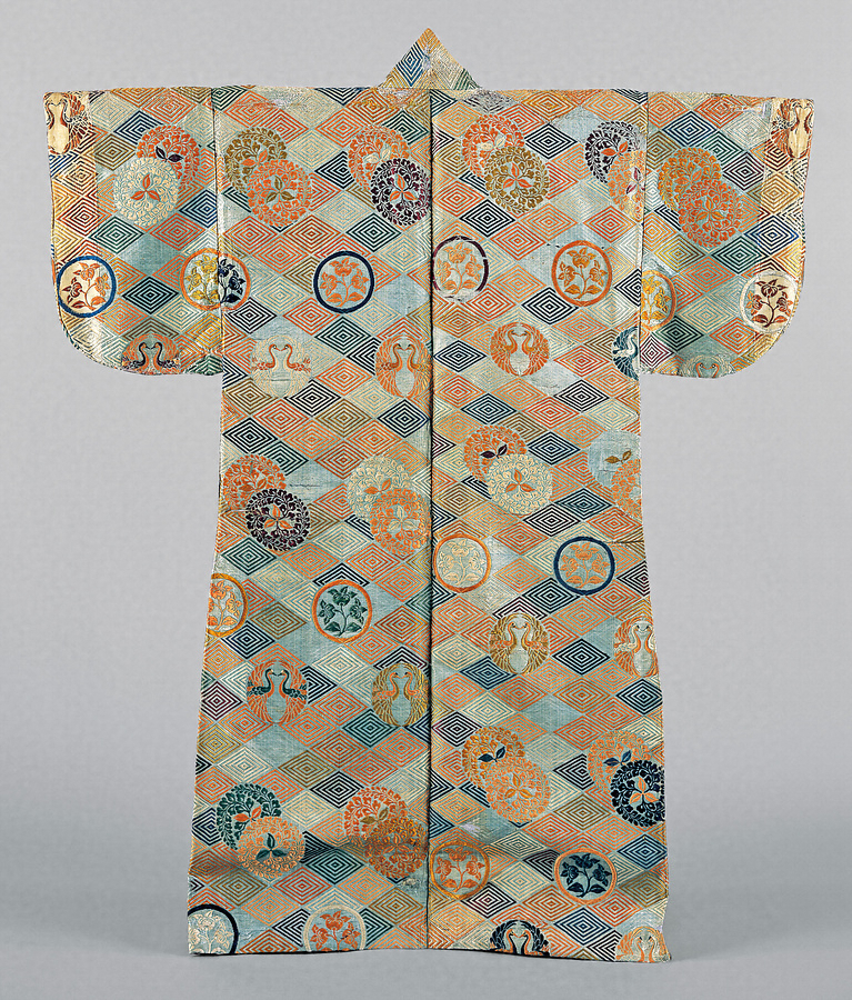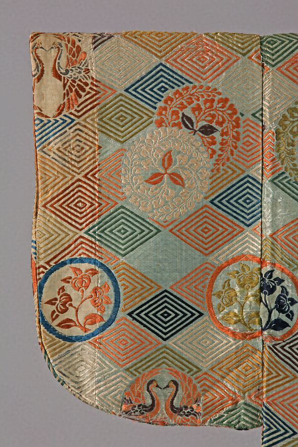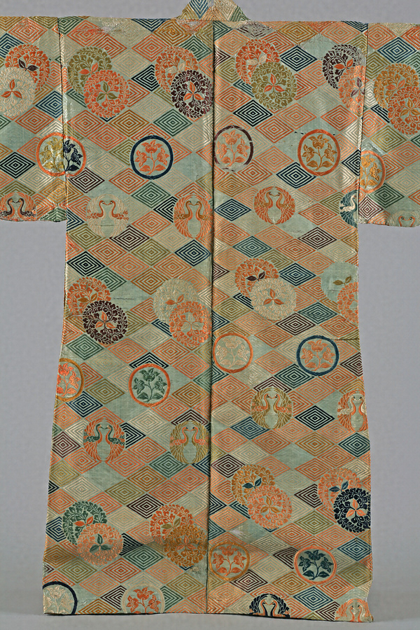 水浅葱色の綾地に紅、萌黄、紫、藍、縹、茶などの色緯で5重の入子菱繋ぎに、向鶴丸紋と橘紋、そして重ねた三藤巴紋を織表す。両袖口側に幅出しのための生地継ぎがあること、意匠形式と金糸を用いない技法から、桃山時代の作と考えられている。