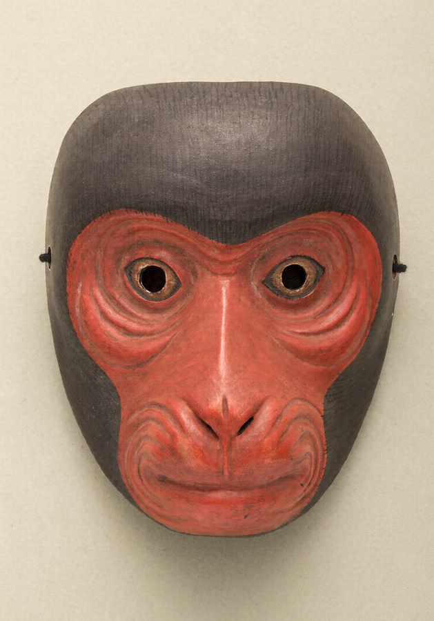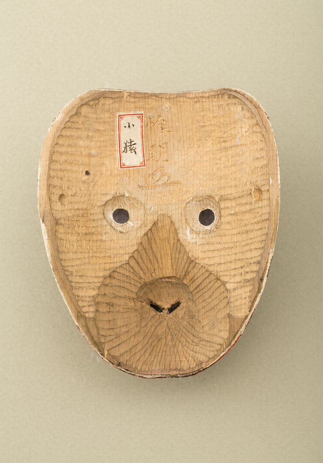 「小猿」は、猿が登場する狂言のうち、猿の役を子方が演じる〈靱猿〉〈猿座頭〉で用いる。子方に相応しい無垢な表情が特徴。漆かぶれを嫌ってか、通常施す裏面の漆を塗らずに白木のまま仕上げている。面裏の額に「惟明(花押)」の彫銘があり、「小猿」との墨書のある貼札がある。