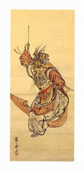 浮世絵師・河鍋暁斎(1831~1889)の円熟期の作品。全体は豪放だが手足の表現は繊細であり、緩急を旨とする舞楽の一瞬の表情をよくとらえている。中野区内旧名主家の伝世品。