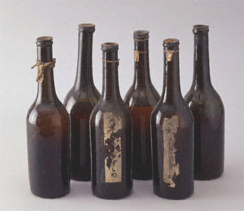 赤葡萄酒の瓶が全部で7本残されている。(写真は、内6本)瓶の形状は微妙ながら異なり、それぞれが手作りであることがわかる。このうち2本には「寅年白来(舶来)五本之内」と書かれた紙が貼られている。武雄鍋島家旧蔵の文書である「長崎方控」にも、天保10(1839)年9月に「此品西記志十(=長崎通詞)献上」として「ローウェイン三瓶」など、「ローウェイン(赤葡萄酒)」や「白葡萄酒」のことが随所に記されている。瓶の中の液体は、赤葡萄酒または油類が予想される。