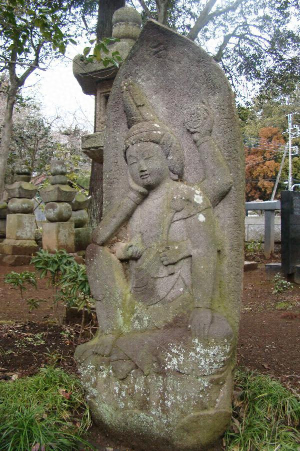 如意輪観音像が中央に陽刻される。光背型。六臂の姿で、垂髷を結い、天冠台をつける。左手は第一手は輪宝を捧げ、第二手は蓮茎を執り、第三手は垂らして膝上におく。右手は第一手はほおに当て、第二手は宝珠を捧げ、第三手は後方に垂らして数珠を執る。顔をやや右に傾け、右膝を立てて蓮台上に坐す。服制は条帛を縣け、裙を着ける。光背部分に文字が陰刻される。