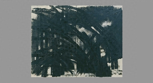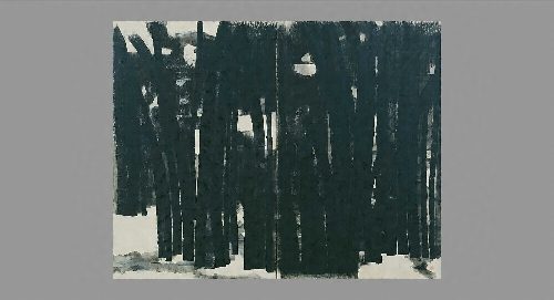 水墨が持つ諧調の幅を活かさず、ほとんど濃墨で表された竹林。原爆による爆風によるものだろうか、左隻にはなぎ倒されて大きく弧を描く竹が描かれている。本図制作の10年前には、「原爆の図」の第7部として、《竹やぶ》という作品を制作しており、被爆した人々が、爆風でしなった竹やぶの中に逃れていく有様を描いている。本作品も同一テーマを展開したものかとも思われるが、ここには、もはや人の姿はない。黒々とした竹は、折り重なってしなりながらも、力強く、明快なものとなっている。