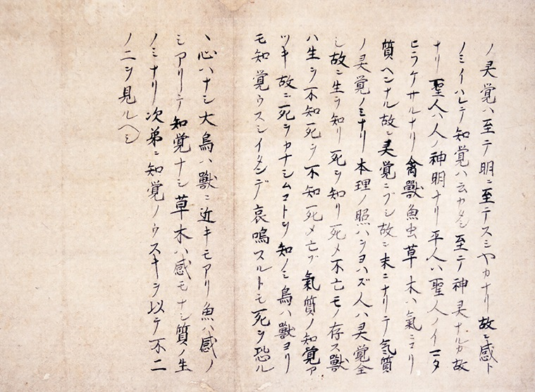 中江藤樹が、人間の知覚について禽獣魚虫草木と比較して論じた原稿の一部を軸装したもの。掛軸は表に「藤樹先生真蹟」と箱書された木箱に収められている。箱裏にも文政13(1830)年の波多橘洲による「中江先生知覚辨片紙原應在江州小川村書堂散人西村生之手不知全編在誰家見首書ノ霊覚云々可識矣雖碎珠片璧乎古賢之真蹟寳可珍襲尊尚之也」との箱書があり、この資料が藤樹書院のある近江国小川村の西村氏が所蔵していること、全編は遺されておらず「ノ霊覚」からはじまる部分を見ることができるのみであるけれども、古い賢人の真蹟であり、宝として大切に伝えていかなければならないことなどが記されている。