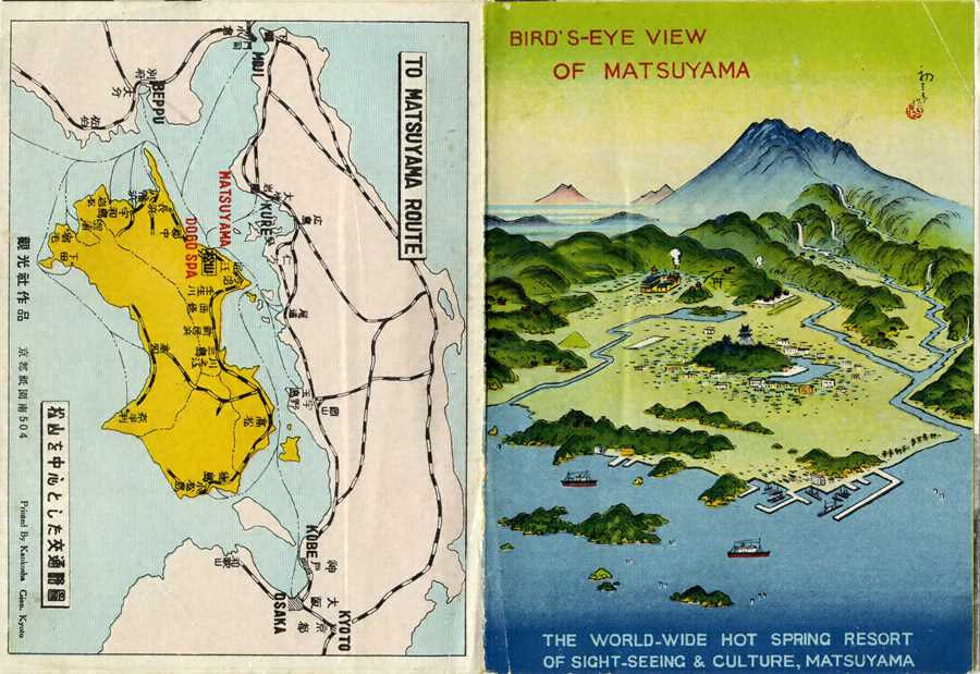 戦後の松山を描いた絵図。当時の人口は、約17万4千人。裏面では、外国人観光客向けに観光名所を英訳している。絵図の左上には鳥瞰図を「BIRD’S|EYEVIEW」、初三郎を「PopularlyknownastheHiroshigeofthepresentage」(当代の広重として一般に知られている)と紹介している。