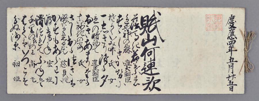 連歌は、複数人で短歌の上句と下句を詠み継いで100句まで続ける。11代佐賀藩主鍋島直大の発句、正室駒姫(胤子)の脇句に続き、連衆として、鍋島直正(10代佐賀藩主)、筆姫(直正継室)、慈貞院(貢姫)、宏姫、尚丸、昶姫など鍋島家御一家による句が続く。慈貞院~昶姫はいずれも直正の子女。慈貞院は連歌の前月、23年ぶりに江戸から佐賀に帰郷したばかりだった。