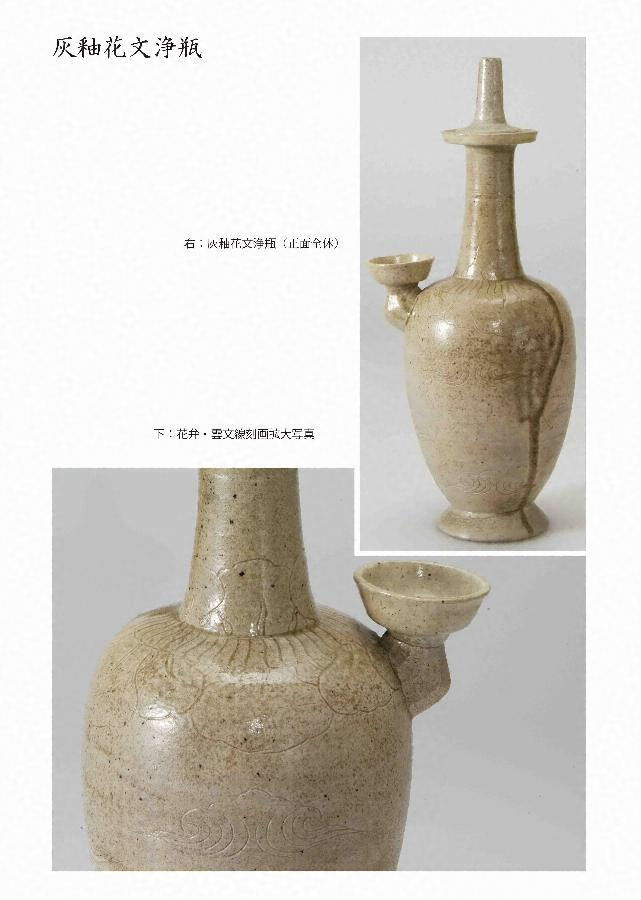 灰を釉薬とした陶製の水瓶。尖台部下位の一部、注口部、高台の一部が欠損している。口縁部は尖台部と接合していないが、同一個体と判断されたため、現状の形に復元した。