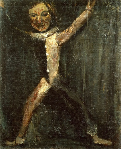 画面からはみ出すほどに大きく描かれたマリオネット人形。三岸節子夫人によれば、このマリオネットは手の内に入るような小さなマスコットの人形であったという。しかし、暗緑色の背景から両手両足をいっぱいに広げて立ちはだかり、不気味な笑いを浮かべた絵の中のその姿は、そのような小さなものとは思えぬほど、そして人形とは思えぬほどに、大きさや生命力を感じさせる。見る人を不安に陥れ、怪奇な夢の世界へ誘い込むかのようである。