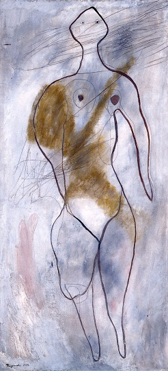 1932(昭和7)年末から翌33年にかけて、ひっかきによる線条表現が三岸好太郎の画面に登場する。節子夫人の回想によれば、「油彩に黒の下塗りとホワイトを厚くほどこしておいて、子供たちに釘や金属の棒を与えて自由に線描をさせた。それが後に女となり、花となったのである。さまざまな無意識の効果を追いながら発足したのである」という。偶然生み出される形象の面白さに三岸は着目したのだろう。それはシュルレアリスムのオートマティスム(自動記述法)にも通じる。そうした前衛的な実験は、1932年暮れに東京で開かれた「巴里東京新興美術展」に衝撃を受けた直後から始められた。この作品はその最初のものとみられる。まさに子どもの落書きのような描線で形取られた裸婦は、裸婦一般のイメージからは大きくかけ離れ、ユーモラスかつグロテスクである。乱雑なひっかき線も飛び交っている。しかし、無造作な線描の効果を追求しながらも、三岸は配色や構図のバランスに繊細な神経をめぐらせている。