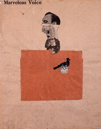 三岸好太郎が、コラージュ(貼り合わせ)の手法による制作を手がけたのは、建築家の山脇巌(1898-1987)との交流がきっかけであったという。山脇との出会いは1921~22年頃のことで、三岸と一緒に上京して東京美術学校建築科に学んだ親友俣野第四郎を介してのことであったが、当初は二人の関係はそれほどには深いものではなかったようである。その後、ドイツの造形教育機関バウハウス学んで1932年に帰国した山脇と再会したのは、翌年4月初めのことであった。ヨーロッパの美術・工芸の新潮流や建築にも関心を高めるようになっていた三岸は、山脇を積極的に訪ねるようになる。バウハウスでは素材や構成研究の一環としてコラージュ(貼り合わせ)を積極的に導入しており、山脇巌、道子夫妻との交流を通して三岸も新聞や雑誌の図版や文字等を素材としたコラージュ作品を手がけるようになった。モティーフのナンセンスな取り合わせを楽しみつつ、自由な画面構成を試みている。そこには必ずしも強いメッセージ性は感じられず、コラージュという新手法に、三岸が生来の実験精神とユーモア感覚を開放し、心躍らせながら制作した様子が想像される。本作で左上に貼り付けられた「Marvelous Voice (マーヴェラス・ヴォイス)」は、「すばらしい(驚くべき)声」の意。有名なイタリアのテノール歌手・エンリコ・カルーソ(1873-1921年)の写真が用いられているともいう。その男性の顔の下半分からのどにかけては、解剖図を切り貼りして、歌声を想像させる趣向だろうか。しかし手にはワインリストをもち、ナプキンリングも置かれていることから、食事を催促しているようにもみえる。