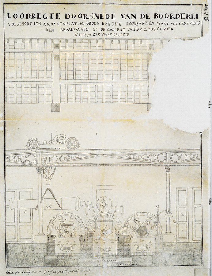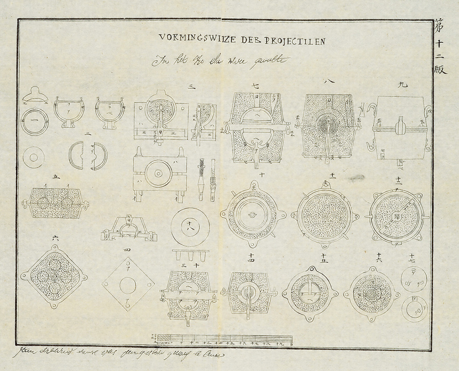 わが国で幕末に始められた鉄製大砲の製造において大きな手掛かりとなったのは、オランダの王立鉄製大砲鋳造所長であるヒュゲニンのテキストだった。本資料はその和訳本『西洋鉄熕鋳造篇』の図解の一部。長崎警備を担う佐賀藩は、嘉永3年(1850)から鉄製大砲鋳造に着手した。藩内では、同種の資料が本藩(藩主家)や重臣である武雄鍋島家への伝来は知られていたが、これは分家のひとつ蓮池鍋島家に伝来したもの。