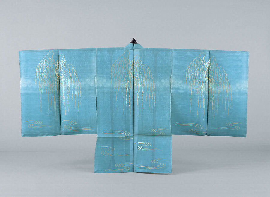 浅葱絽地に平金糸で枝垂柳に流水を織り表わした涼し気な装束である。