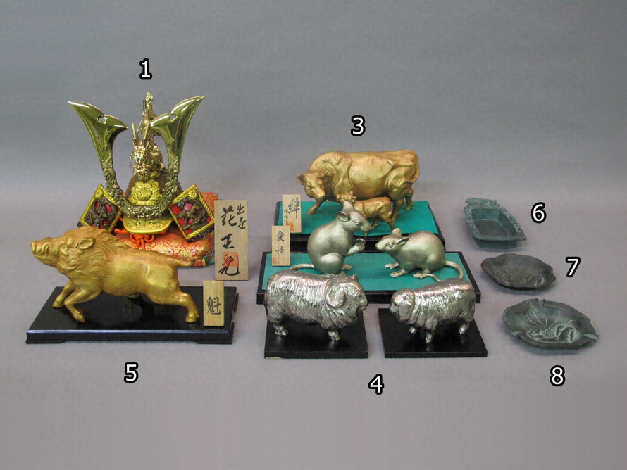 生型技法によって製作された兜や十二支の置物、灰皿などの高岡銅器製品である。