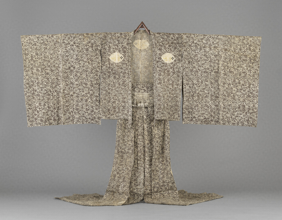 濃茶麻地に2枚の染型を使い、地文のように大柄な花唐草を配し、上文のように鳳凰と花唐草を配した機知に富んだ意匠。胸と背と袖、長袴の腰板と相引の薺紋には、内側に自紋とみられる「井桁に桜紋」が据えられている。