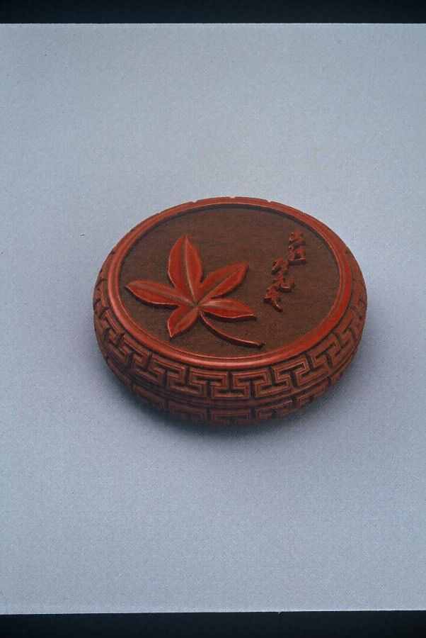朱を塗り重ねた堆朱の香合で、青海波の地文に紅葉を一枚彫り表し、『古今和歌集』にある菅原道真の「このたびはぬさもとりあへず たむけ山紅葉の錦 神のまにまに」(巻第9 羈旅歌)の上の句、「古能太飛盤」を変体仮名で彫り出している。側面は一文地の地文である。