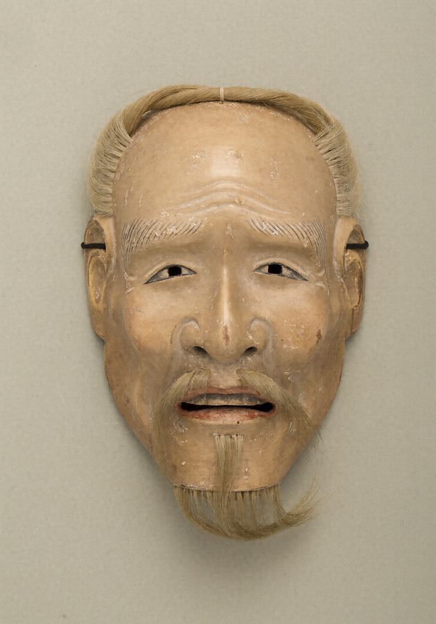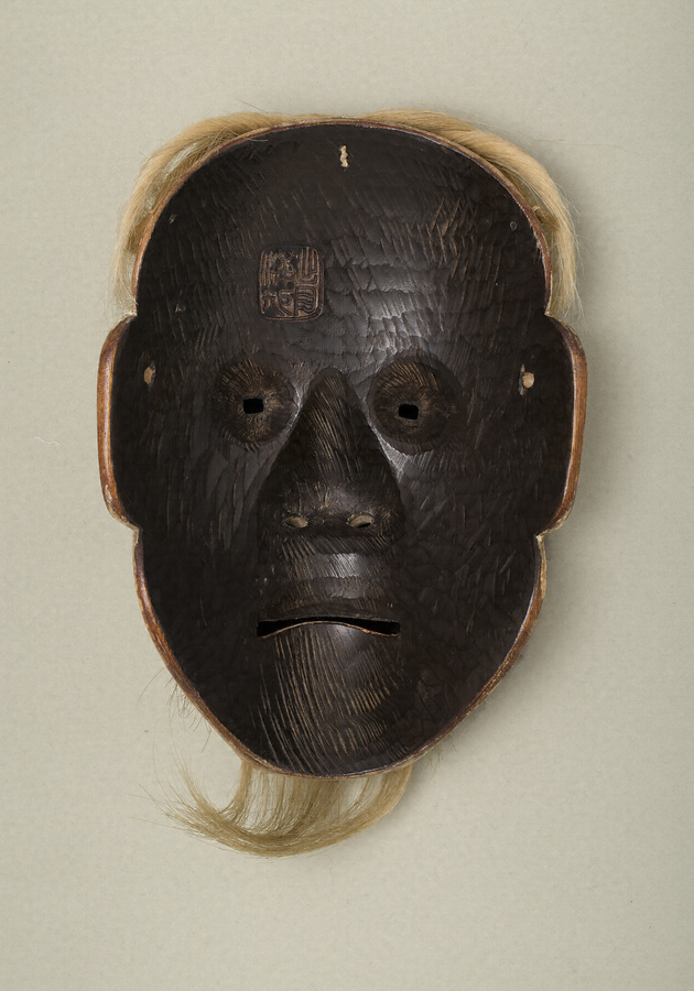 身分の賤しい老翁の面。額または頬の瘤が立っているところからの名称という。この面は鼻下の髭を植毛にして「髭阿瘤尉」とする。面長な顔立ちや奥目がちな目、鋭角的に突き出た頬など、異国の尉の雰囲気も醸している。面裏には、「出目満矩」の焼印を捺す。