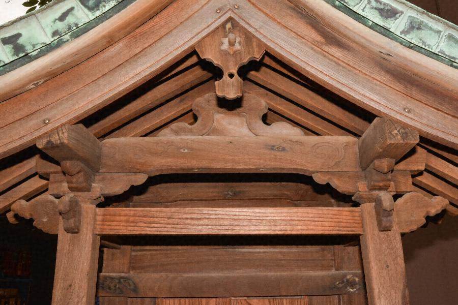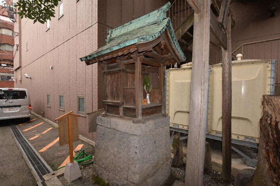 敷地東辺中央の切石積檀上に建つ、一間社見世棚造、銅板葺で、見世棚社殿には珍しい切妻造妻入とする。身舎は板壁とし、庇柱を木鼻付頭貫で固め、柱上に大斗と実肘木を載せて虹梁と桁を受け、虹梁上に蟇股を置く。簡素な小社ながら細部に時代的特徴をよく示す。