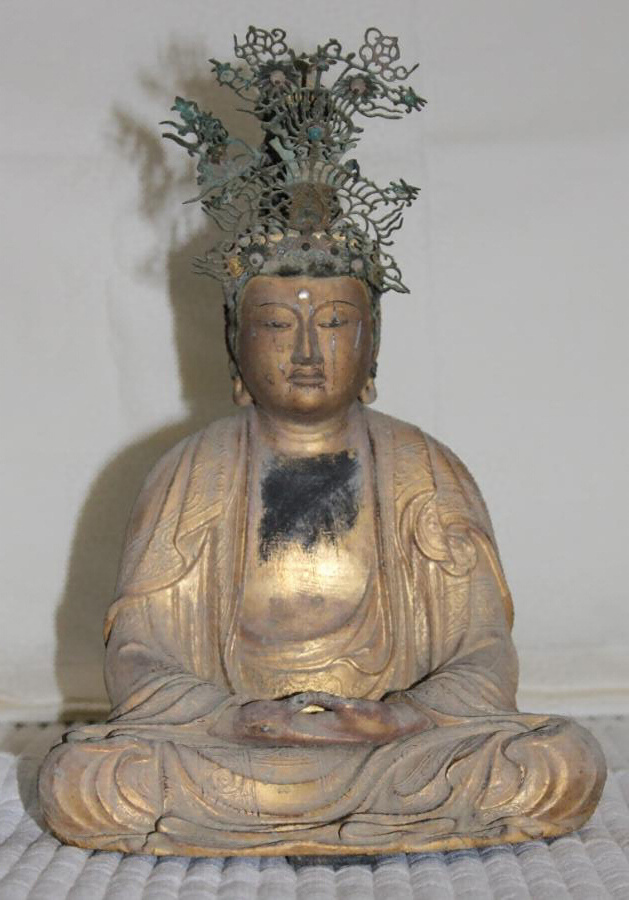 ヒノキ材、寄木造、玉眼、漆箔、衣部に盛り上げ彩色、内部に束あり。