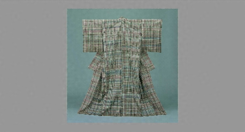 志村ふくみは、自然染料で自ら糸を染め、紡ぎを制作しています。この作品は植物の“おだまき”をイメージしています。苧環(おだまき)は、キンポウゲ科の多年草で、4月5月頃長い花茎の先に青紫色の花を咲かせます。作品の縦横に走る格子柄のなかに見える、青紫色の格子が“おだまき”の花を表現しているのでしょう。可憐な“おだまき”の風情が感じられます。志村ふくみは、大正13(1924)年滋賀県近江八幡市生まれ。昭和17(1942)年に文化学院を卒業。昭和30(1955)年、染織の道を志し、郷里の近江八幡で植物染料による染織の研究を独自に始める。昭和32(1957)年の第4回日本伝統工芸展に初出品で入選。翌5回展から第8回展まで紬織り着物により、連続して4回の受賞を重ね、昭和37(1962)年の第9回展からは特待出品者となり注目された。日本の伝統である紬織りを、作者自身の豊かな感性と想像力を生かし、古来の単純な縞、絣を用いながら芸術作品にまで発展させた。昭和55(1990)年、重要無形文化財保持者(いわゆる人間国宝)に認定され、平成5(1993)年文化功労者となる。文筆活動も行い、著書に昭和58(1983)年「一色一生」「語りかける花」などがある。