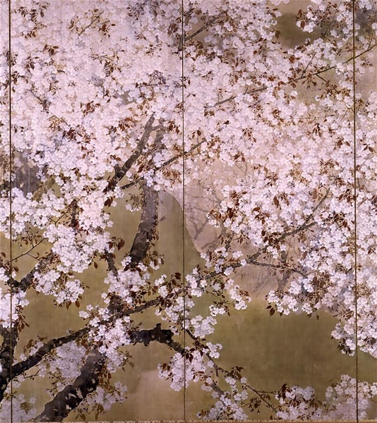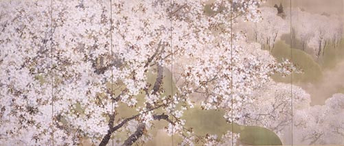 吉野山に題を得たこの作品で、菊池芳文は、桜の名手といわれたその名人芸を発揮すると同時に、その高度の芸をも感傷的に眺めるような観照の世界を、無理のない画面の構成のうちに展開させた。見る人は、まず、名手の技巧を示す左隻の満面の桜に目を向け、そのこともなげな美しさからおのずと遠い桜に目を転じつつ、右隻の、遠い桜と煙雨とのまぎれの中に開かれる画家の観照の世界へと誘(いざ)なわれていくだろう。古来、桜の名所として歌にきこえた吉野山であるが、谷ごしに遠くの桜が煙雲とまぎれる光景は、「み吉野の吉野の山の桜花 白雲とのみ見えまがひつつ」と古歌にも詠まれているように、古くからよく吉野の桜が開く観照のモティーフとなっており、芳文はこのモティーフを小雨に煙る吉野山に着想した。このモティーフによって、左から右へ、華やかな花鳥画の世界は、花と雲とがまぎれる風景のひろがりのなかで、どこかしめやかな観照へと転じていく。風景の観照には、「歌書よりも軍書に悲し吉野山」とうたわれた悲劇の舞台への歴史的感傷が漂うからである。芳文にとって吉野山の風景は、その桜ゆえに、華麗な花鳥画の舞台となる一方、その歴史ゆえに、しめやかな観照の舞台でもあった。その結果、花鳥画の華麗な技巧も、画家自身の観照のうちに、たくまざるものとなって、こともなげに漂い出ている。改まった構えのない静かな歴史的観照のうちに漂い出る消えゆくものの美しさに、四条派の最後を飾るといわれた芳文らしさがうかがえる。第8回文展出品作。