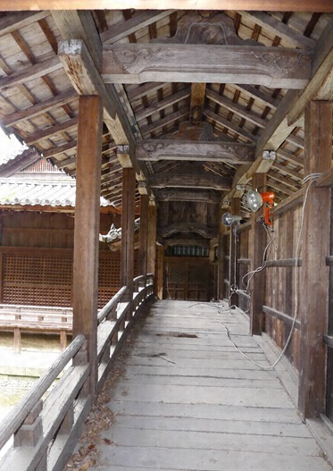 本社拝殿と祖霊社本殿を南北に繋ぐ、長さ約一〇メートルの渡廊。南寄り約三メートルを落棟にし、北寄りは間柱を入れて柱上に舟肘木を据え、梁行の各柱間に虹梁を架けて蟇股で棟木を受ける。軸部はやや木太いが、太鼓状の床桁や反りのある垂木が軽快さを創る。