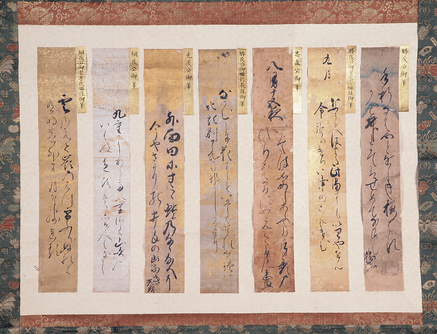 初代佐賀藩主鍋島勝茂、勝茂室茶々姫(高源院)、勝茂嫡男忠直、勝茂娘長姫(永春院/島原藩主松平忠房に嫁す)、2代佐賀藩主鍋島光茂、3代佐賀藩主鍋島綱茂、綱茂室普与(寂光院)という、江戸前期の佐賀藩主鍋島家の当主や正室、娘ら7名の和歌短冊を貼り交ぜた1幅。