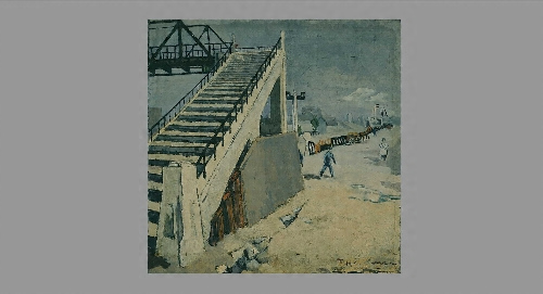この作品に描かれているのは、広島駅近くの愛宕跨線橋。画面を分断するように、鋭く立ち上がる陸橋の橋脚。対照的に、なだらかに続く背後の空間と、ごく小さく描かれた機関庫の制服姿の人物が、陸橋の力強い造形を強調し、橋脚へと視線を引きつけます。丹念に絵の具を塗り重ねて表現した、強い光を照り返すコンクリートの黄白色は、黒々とした鋼鉄のトラス橋との対比によって輝きと強さを増し、山路によって「白熱的」な白と評されました。檜山の機関庫入所と時を同じくして架設されたこの陸橋は近年まで現存、いまだ多くの人々の記憶に残っています。