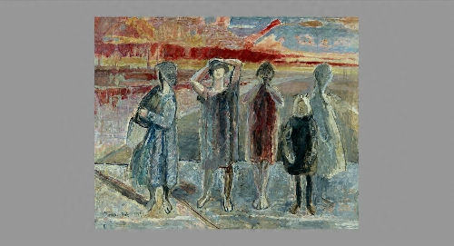 水辺にたたずむ五人の人物。強い光に照らされ、背後を振り返る女性の視線をたどると、茜色に染まりつつある空が、水面に美しく映じています。鋭敏な色彩感覚を示す水辺の表現は、川や海の景色に親しんだ、郷里での視覚体験から培われたものでしょうか。