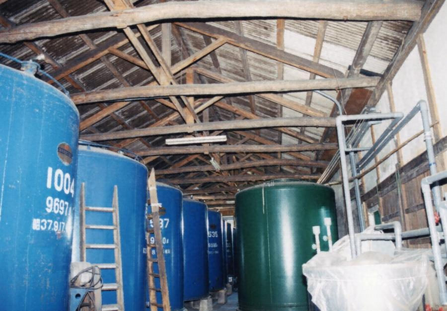 恵比寿蔵と呼ばれる中心敷地の北東隅、背戸蔵から並んで東側に東西棟で建つ。平屋建で、小屋組はキングポストトラスを組む。切妻造の屋根を架ける。内部に大型のタンクを並べるため、窓を軒下の高い位置に開ける。背戸蔵と並んで通りの景観に寄与する。