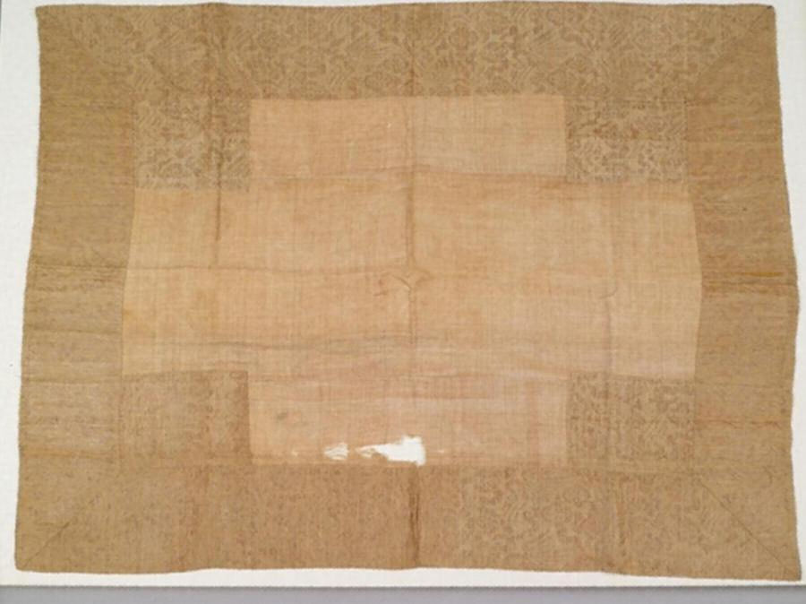 座具は、縁の部分が袈裟の条の部分と同じ繻子織りで、素材の中心部分は麻による平織り。