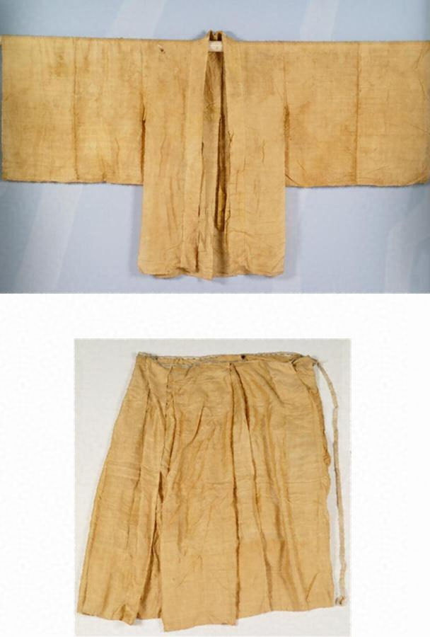 法衣は上下別で、絹糸の平織り、とても柔らかく軽い。袈裟は七条袈裟で、地は経緯絹で、精錬されず、撚りのない生糸で織られている。組織は綾織りで入子菱模様、色は黄色で、天然染料による。条の部分は経が絹糸で、緯は木綿の糸と銀糸で織られ、雲に交互に向かい合わせた鳳凰模様がみてとれる。地の破損が著しく、条の部分は色褪せて銀糸は銀が剥がれ落ちているが、非常に繊細な作りで軽い。