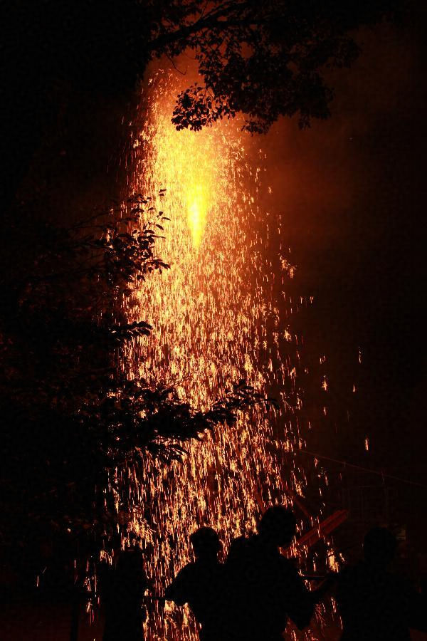 の先から火の粉が飛び散る花火である。立江では、吹筒花火を「立つ火」