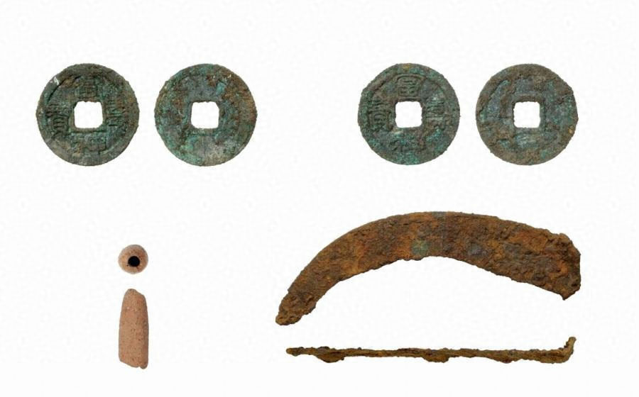 城山遺跡の住居跡から出土した、皇朝十二銭の1つである冨壽神寶2点、鉄鎌1点と土錘1点。