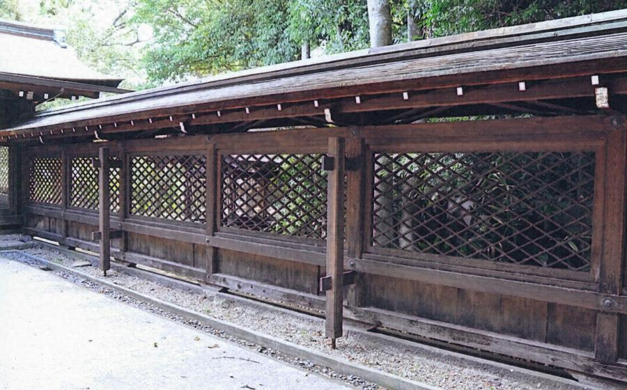 本殿の側背面にコ字形に配された透塀で、側面六間、背面八間とし、前端は拝殿釣殿端部に取付く。基壇上に建ち、腰までを羽目板、腰長押と内法長押で軸を固め、菱格子をはめる。軒は疎垂木で、屋根は銅板葺とする。簡素な意匠ながら、格調高い結界装置である。