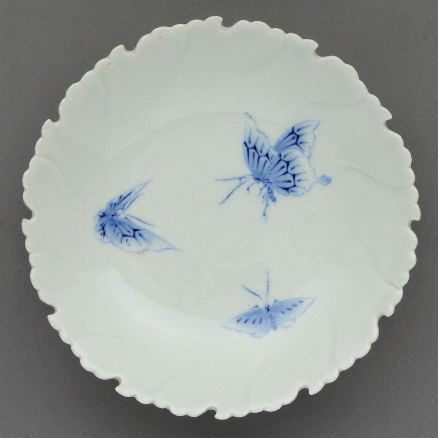 器形を牡丹の花弁形に象り、染付で三羽の蝶を配して、牡丹の花に群れる蝶をあらわした瀟洒な作品。11代将軍・徳川家斉の娘で、10代佐賀藩主鍋島直正の室となった盛姫が、江戸城大奥向けに作らせたと伝わる。牡丹にしばしば取り合わされる蝶は、その華麗な姿から古くより好まれた文様である。長寿の意味をもつ吉祥文であり、また不死不滅のシンボルとして武士の紋章にもなっている。
