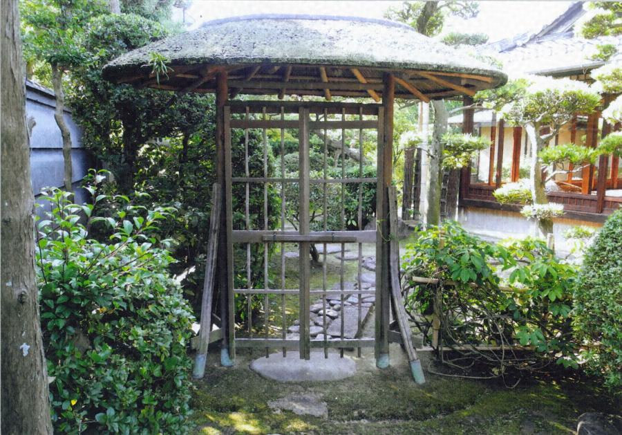 編笠門形式の棟門で、檜皮を葺く。丸太柱を根曲りのナグリ材の控柱で支え、竹簀戸を両開きに吊る。屋根は楕円平面で丸太垂木を放射状に配り、楕円状の小舞と広小舞、放射状のガマを重ねて軒を構成する。茶人であった施主の好みを示す、妙味豊かな露地門。