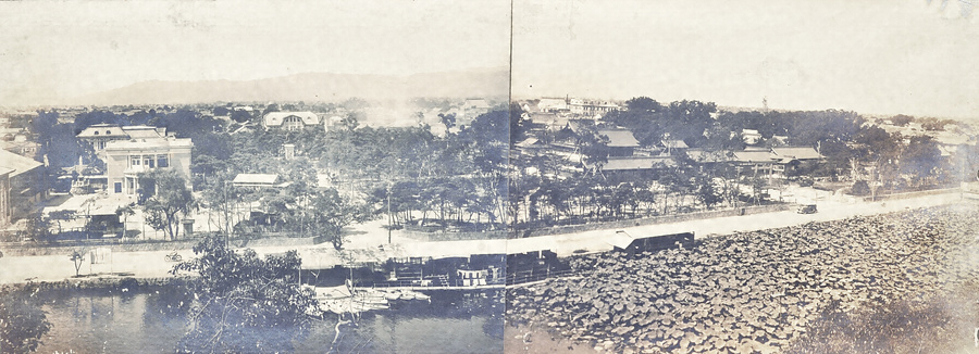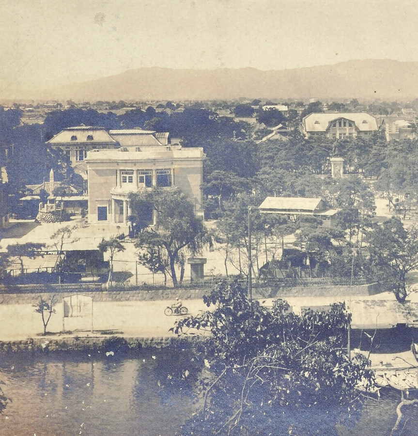 手前に広がる佐賀城堀(北堀)にはボートが繋留し蓮が群生している。銅像園には徴古館と弘道館記念碑、昭和8年創建の佐嘉神社が現在と同じ場所に建っている。徴古館の左奥が佐賀図書館、右には10代佐賀藩主鍋島直正の銅像。昭和7年着工の貫通道路も見えることから、銅像が供出される昭和19年以前の昭和10年代の様子と推定される。