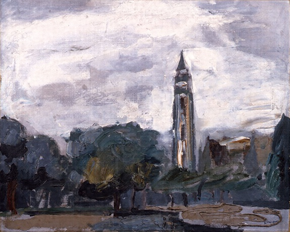 巨人にたとえられた望楼は、1927(昭和2)年に大通公園の東はずれの創成川沿いに建てられた札幌消防本部。現在の札幌テレビ塔のやや南側に位置し、1965年に取り壊されるまでその姿を見ることができた。本作では大通公園の西3丁目あたりから東をとらえている。望楼の右手の三角屋根の建物は、ツタの絡まる会堂の外観が親しまれ〈大通教会〉とも呼ばれていた札幌組合基督教会。左の木立は三岸が個展を開催した豊平館の庭である。初秋の札幌の空気をのびやかなタッチと独特の色づかいで表現している。