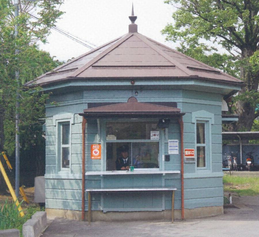 大学正門北脇に建つ。木造平屋建、寄棟造鋼板葺の小規模な建物。正面は両角を隅切した半八角平面で事務室と窓口を設け、背面に畳敷の休憩室を置く。外観は下見板張とし窓上部や棟飾りに装飾を配する。学内で二度の移築を経てなお学舎の歴史的景観を伝える。