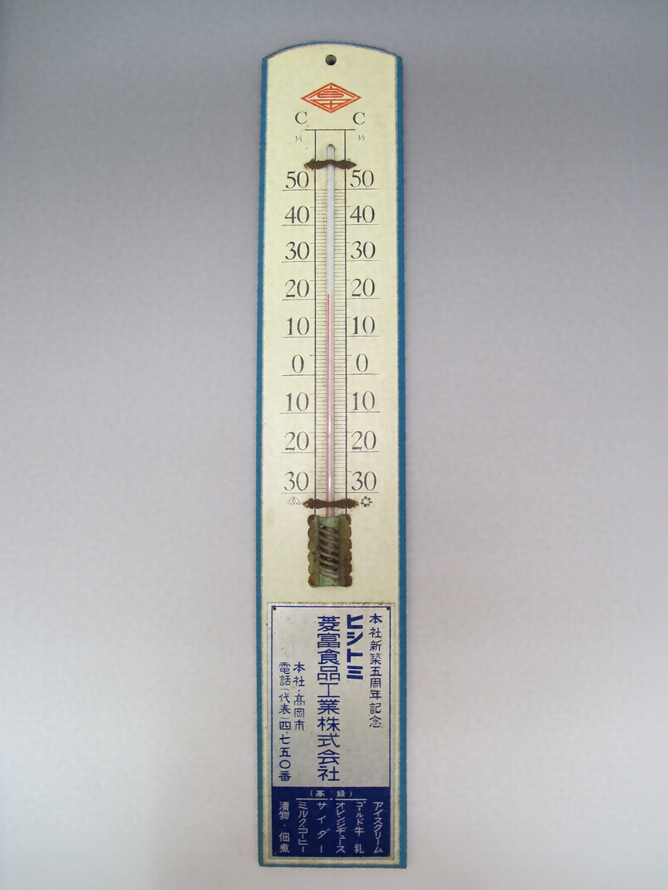 菱富食品工業株式会社が本社の新築5周年を記念して製作した寒暖計である。