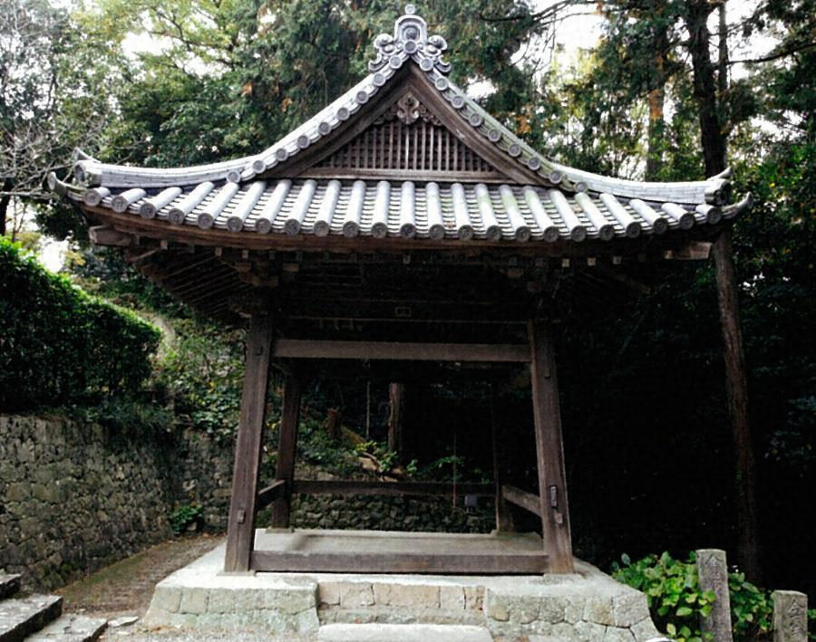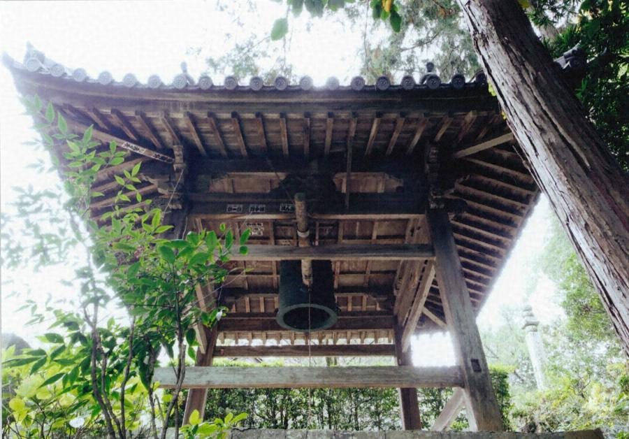 本堂へ登る石段の参道脇に建つ吹放ち形式の鐘楼で、入母屋造本瓦葺である。面取角柱を四方転びに立て、貫で繋ぐ。頭貫木鼻に獅子彫刻を飾り、頭貫上に台輪を廻して三斗を組み、中備に龍や波紋に彫刻化した蟇股を飾る。境内景観に寄与する端正な意匠の鐘楼。