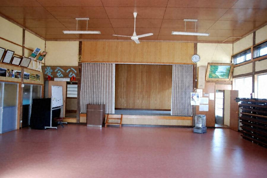 緩やかな斜面地に建つ。木造平屋建、入母屋造桟瓦葺で、南側正面には起り屋根の庇を設ける。南寄りに舞台を備える六〇畳大の集会室とし、北半には畳敷き数室を配する。公民館建築としては比較的大規模なもので、今日まで地域で広く親しまれている。