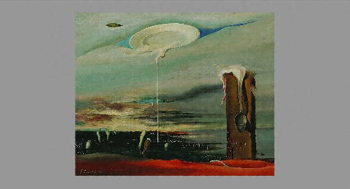 夢や無意識の世界に注目したシュルレアリスム運動が、ヨーロッパで花開いた1920年代。その影響は間もなく日本にも及びました。この作品は、溶けて滴り落ちる皿や曲がったスプーンなど、日常性からの逸脱に、シュルレアリスムの受容を見ることができます。地平線のかなたまで無限に広がるような情景や、木のドアとの対比により巨大に見える食器は、<果てしない餐食>=<終わりのない食事>が持つ、破壊的な力を暗示するのでしょうか。