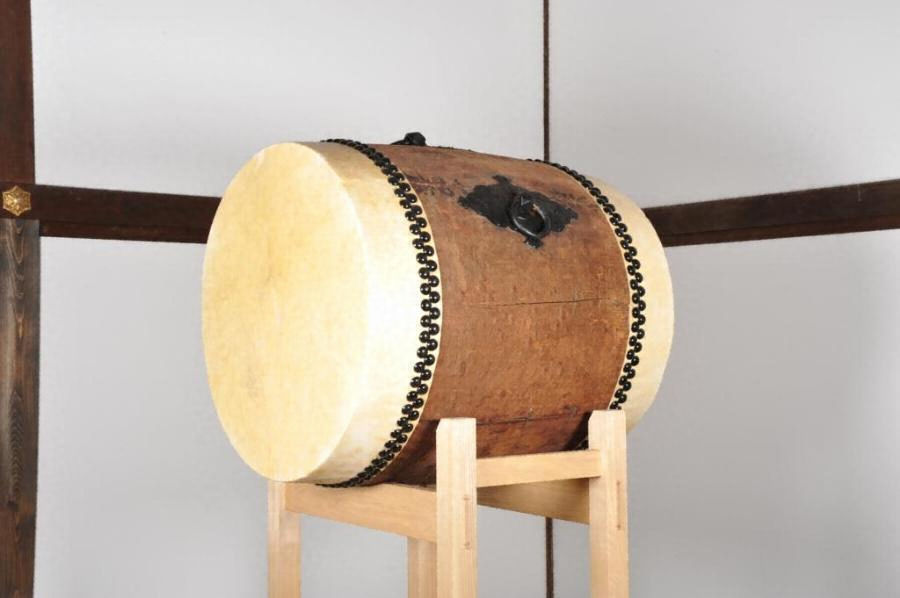 胴部は木製(ケヤキか)で、中央があまり張り出さない、ほぼ円筒形状を呈する。両端に皮を張り、鉄鋲で留める。吊り金具(鉄製)は三箇所に施され、いずれも同型。金具の裏面に付けられた板状の留め金具二枚を胴裏に通し、木材で固定する。